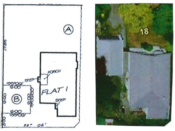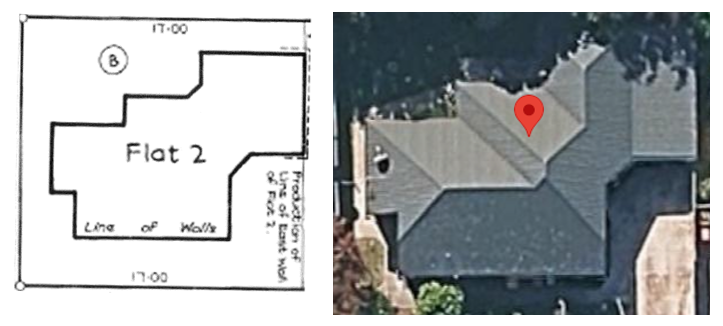 Below is an example of a property where the Flat Plan is not consistent with the physical layout of the property. This is because the location of the garage (shown as “B” on the Flat Plan) is recorded as being in line with the back of the house. You’ll see from the aerial map of the property that the garage is actually located much closer to the road. There is therefore a defect in this Title.